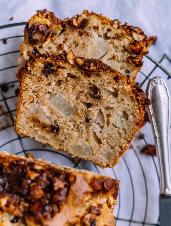 This post is also available in english.Wir lassen ganz entspannt das Wochenende einläuten und am besten gelingt uns das mit einem würzigen Birnen-Nusskuchen. Aber nicht nur die süßen Birnen machen den Kuchen so besonders und schmackhaft. Wir haben noch Schokolade und karamellisierten Nüsse auf die Zutaten-Liste gepackt. Und sind mehr als zu frieden.