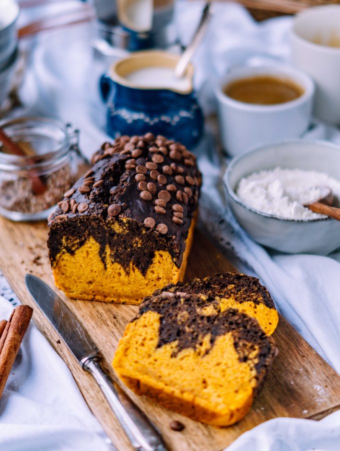 This post is also available in english.Wenn draußen sich langsam die Blätter verfärben und die gemütliche Zeit des Jahres beginnt, dann ist die perfekte Zeit für Kürbis! Genauer gesagt für einen Schokoladen Kürbiskuchen. Der Marmorkuchen ist saftig und so lecker. Die perfekte alternative zu einem normalen Marmorkuchen.