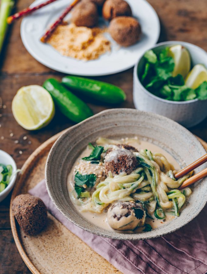 Tofu Balls with Peanut butter sauce & cucumber zoodles